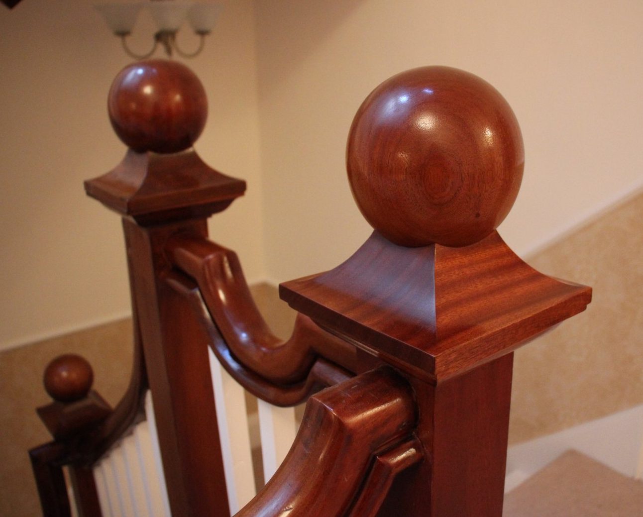 Mahogany newel cap ball, fitted to customers staircase and French polished. The originals are on the left, my new replacement on the right.