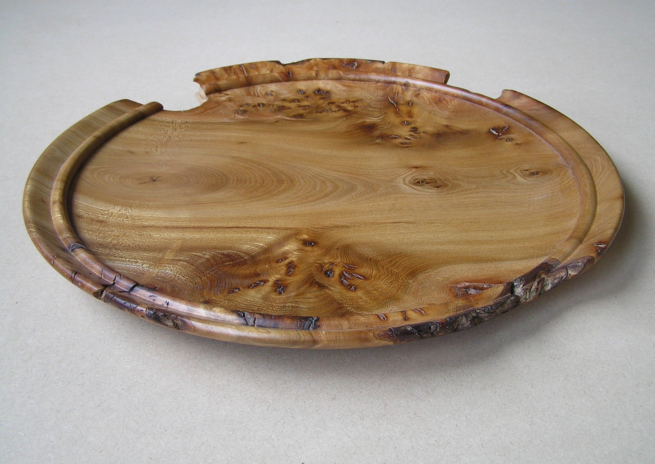Elm platter Published July 21, 2013 at 2202 × 1561 in Woodturning Elm Platter Elm platter, turned with sections of natural edge, 40 cm diameter. Finished with Danish oil.
