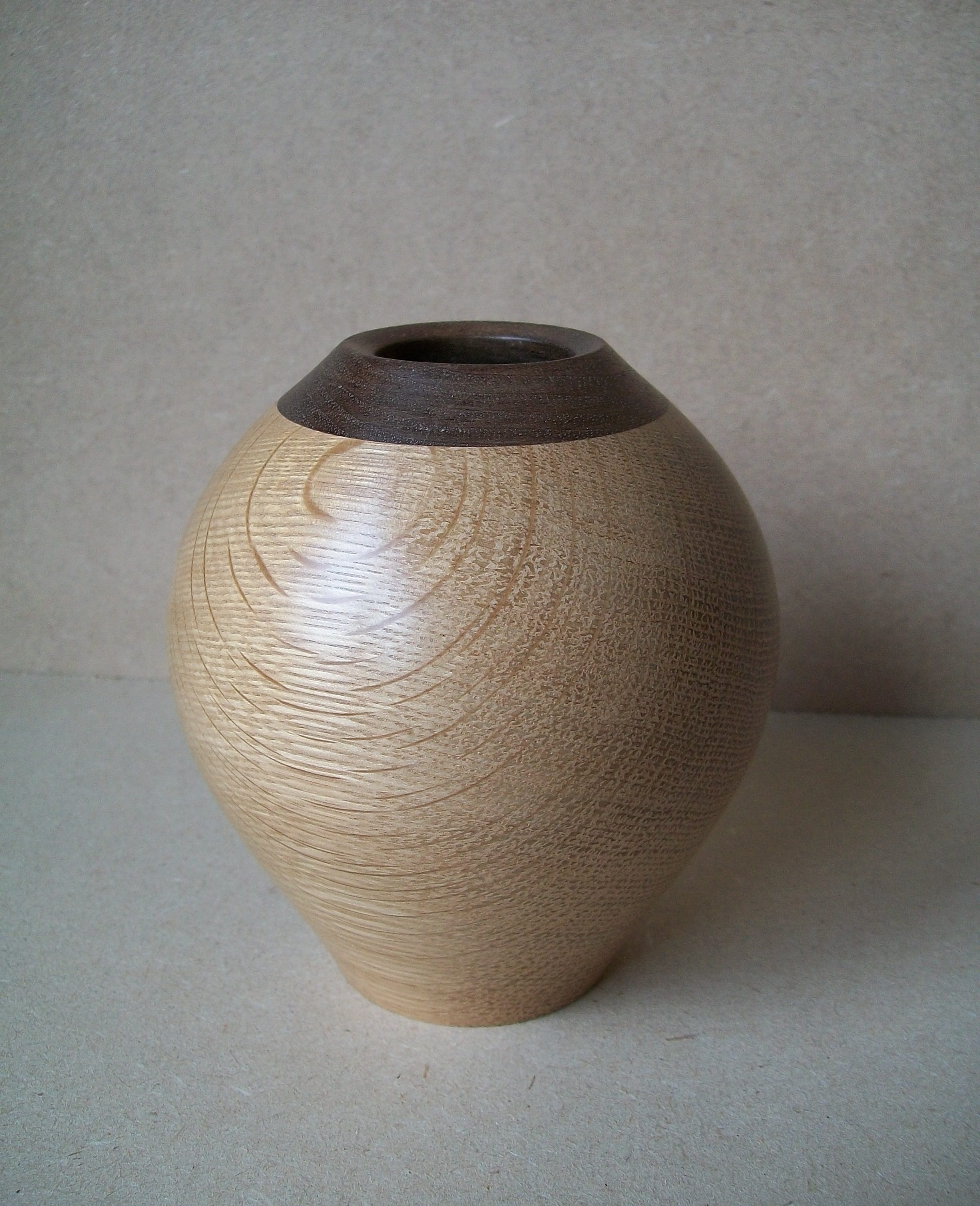oak and walnut vase Published October 30, 2012 at 2448 × 3011 in Woodturning Oak and walnut vase Hollow turned vase, in native oak with a black walnut rim. Height 11 cm.