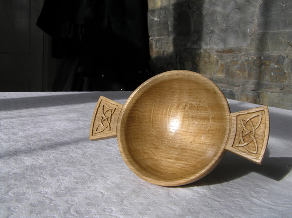 Quaich Published February 14, 2013 at 600 × 449 in Woodturning Quaich This Quaich is turned from oak, with a Celtic knotwork design hand carved onto the lugs, or handles. It was made as a special wedding gift.